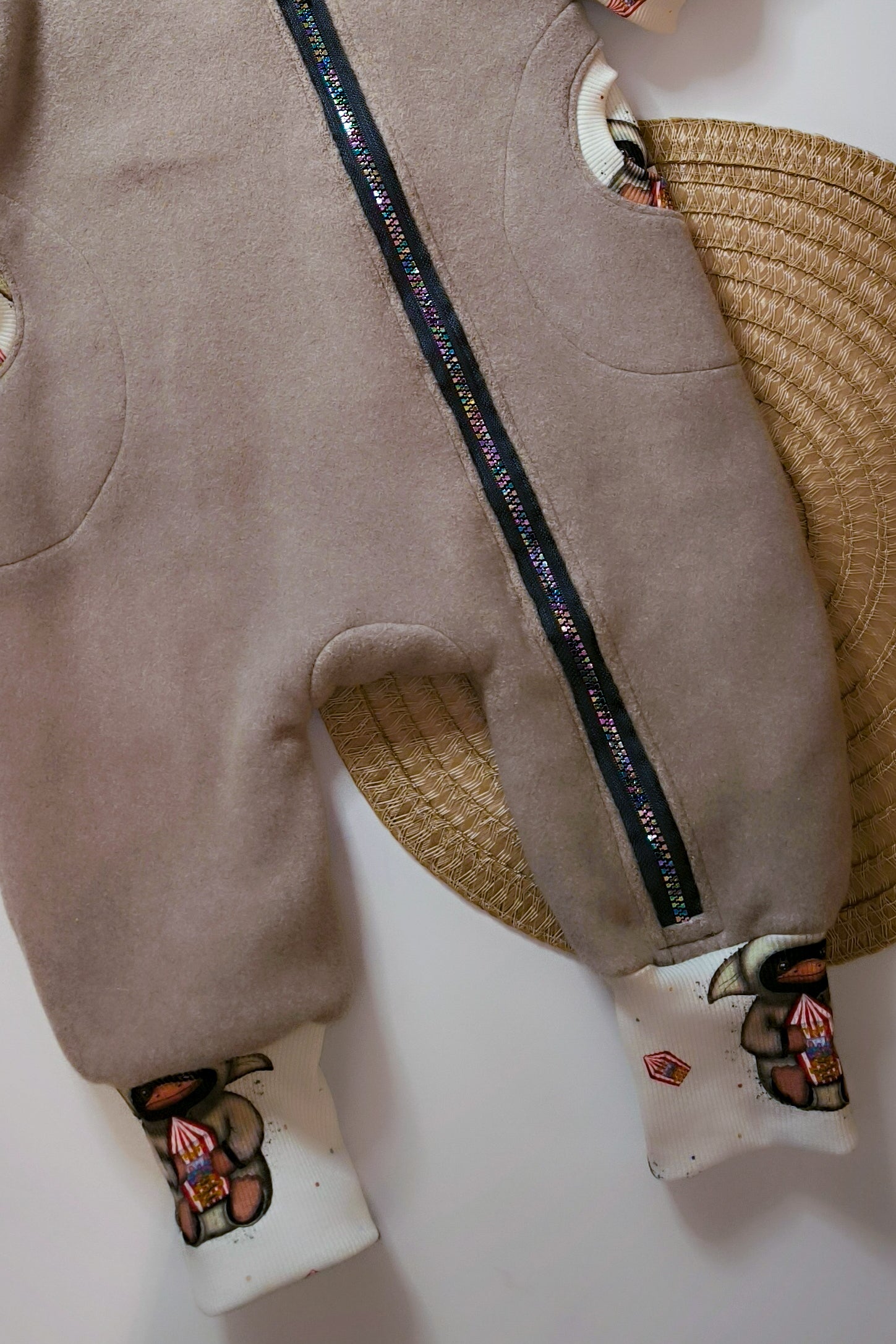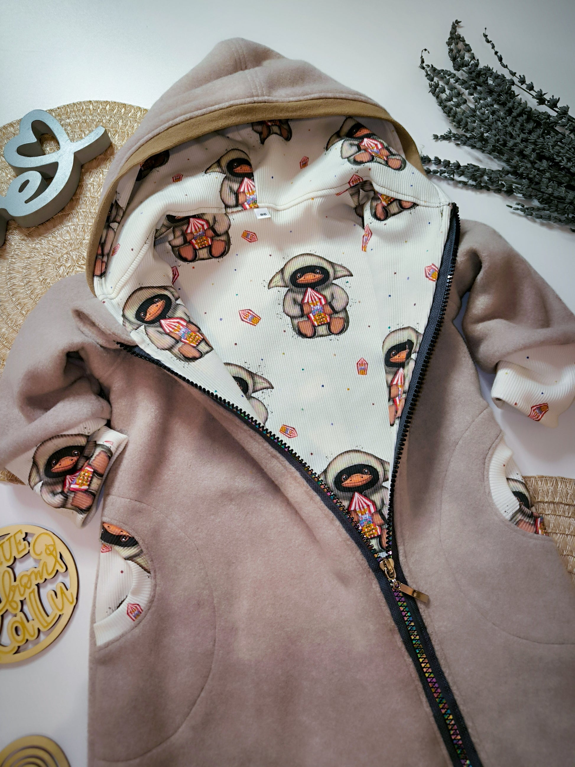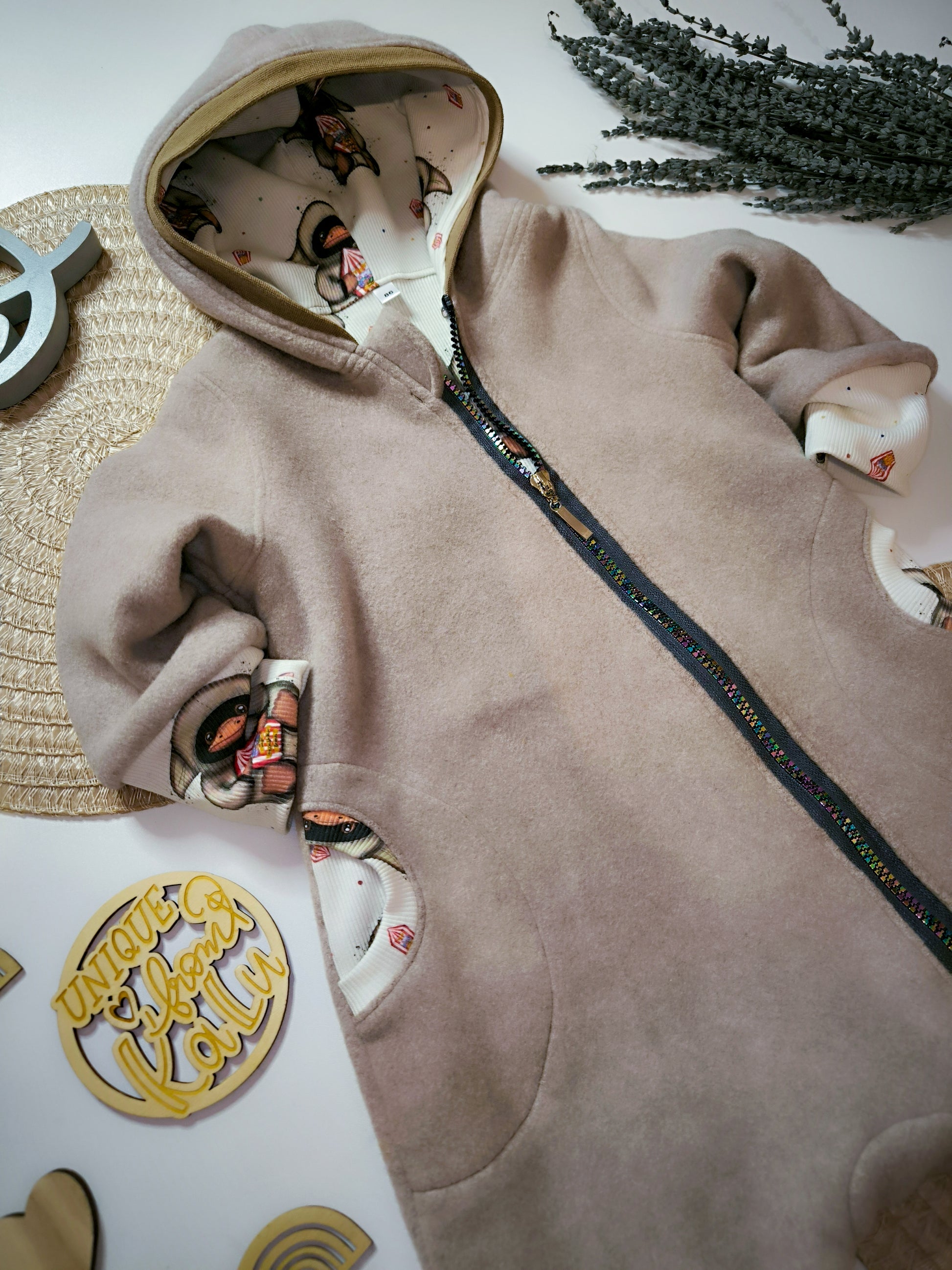 Den Overall füttere ich dir innen mit einem angenehm weichen Jersey oder French Terry . Der Außenstoff ist ein kuschelig weicher Fleece. Die Seitentaschen geben genug Platz für kleine Schätze die dein Kind findet.