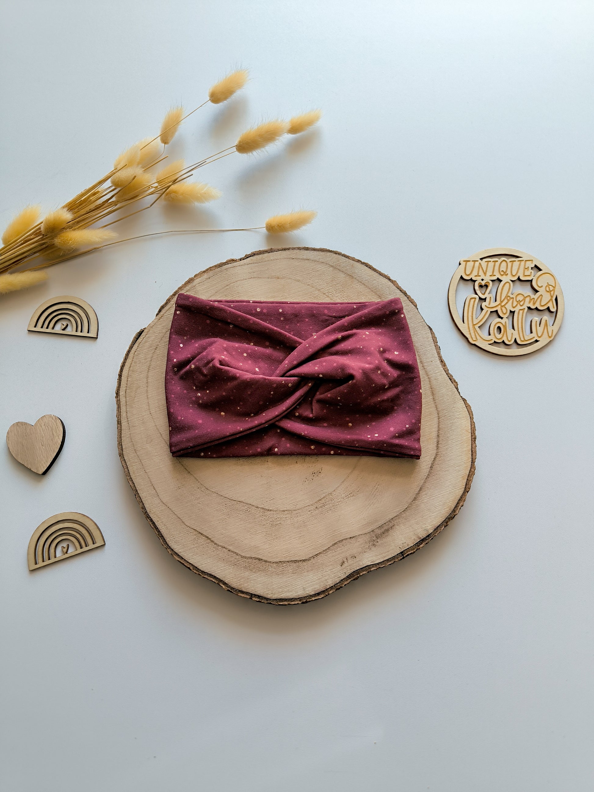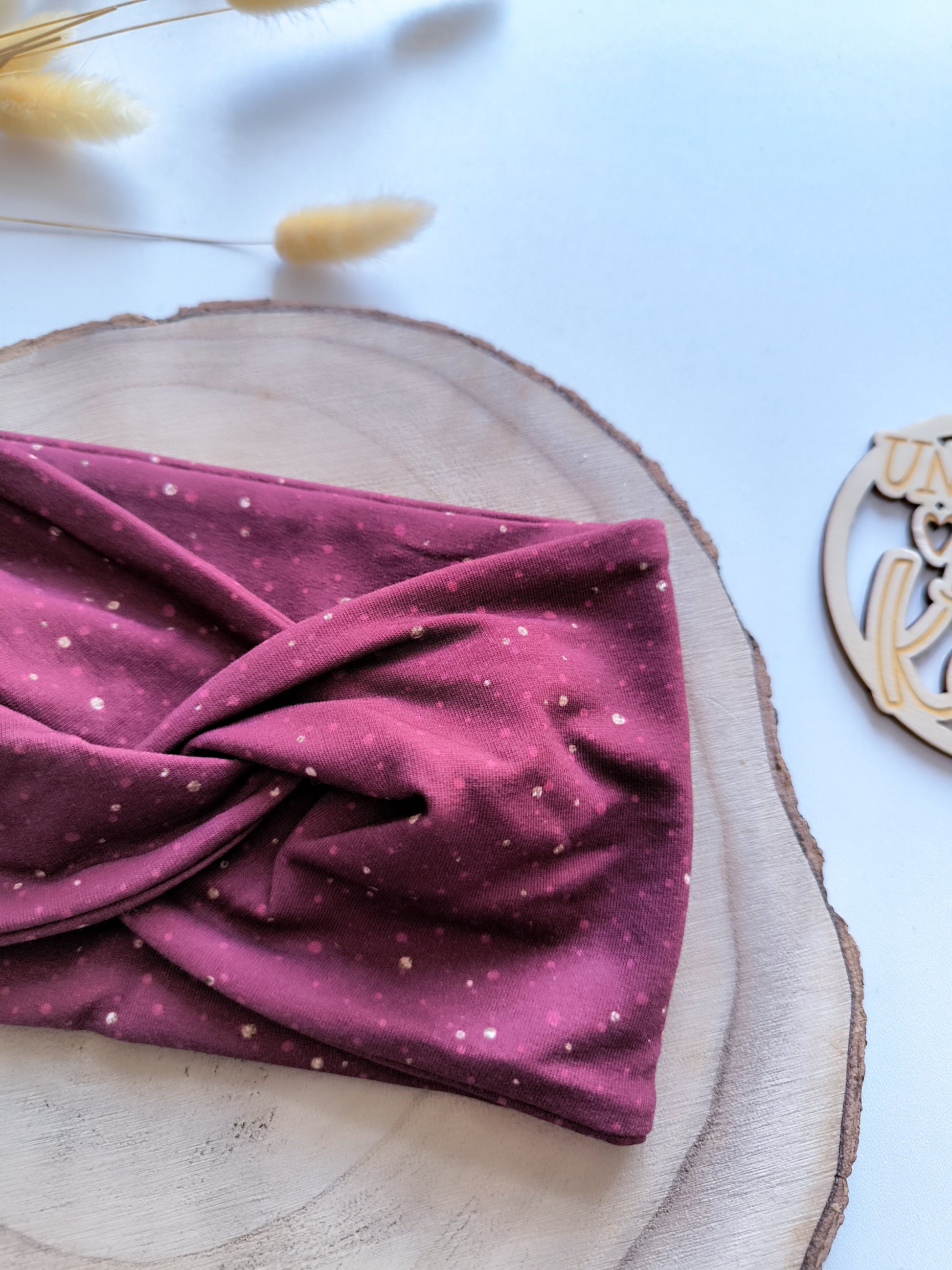 Hier siehst du ein Haarband in Turban Optik , es ist aus einem Beerefarbenen Jersey mit kleinen Punkten genäht.