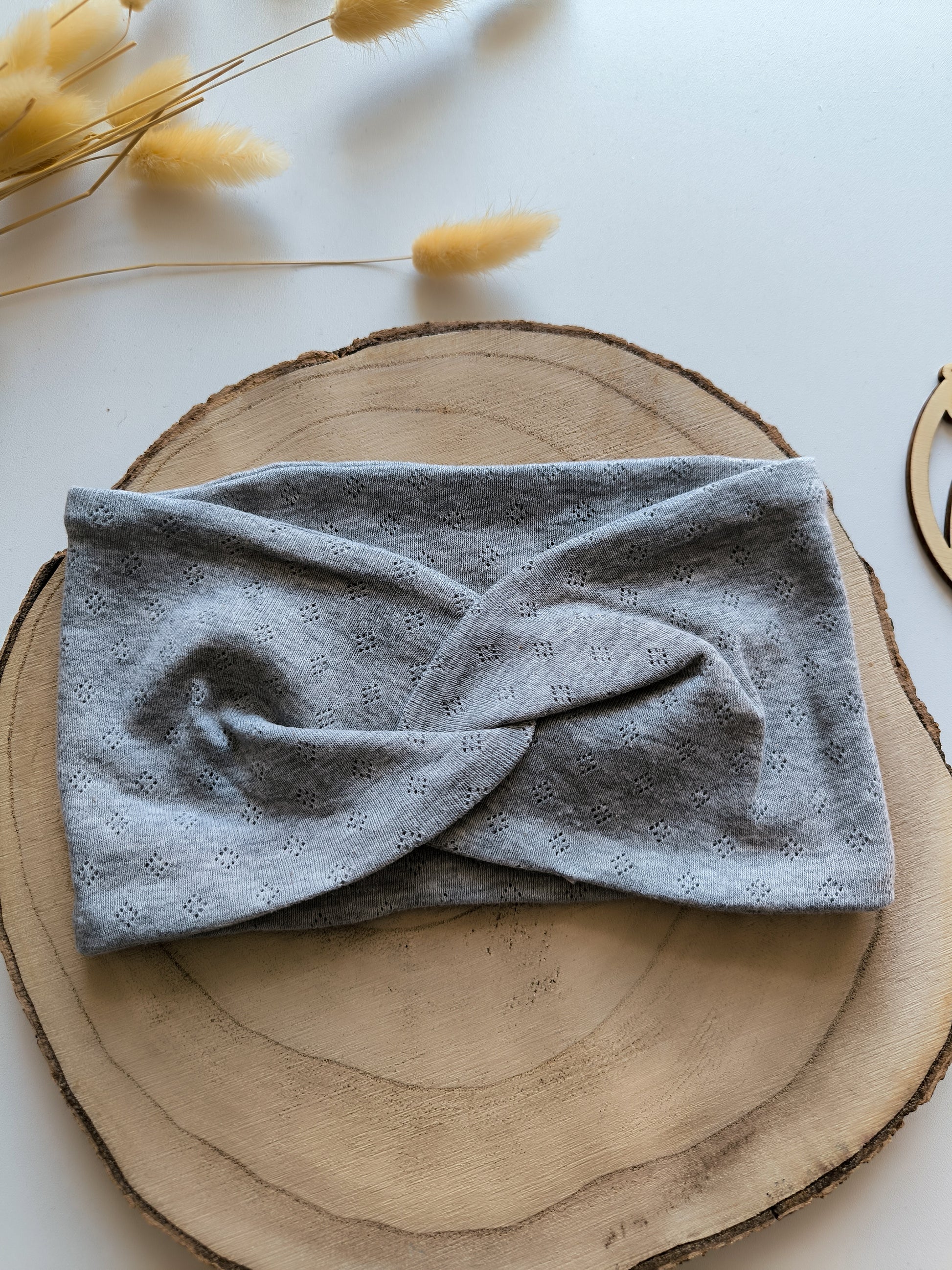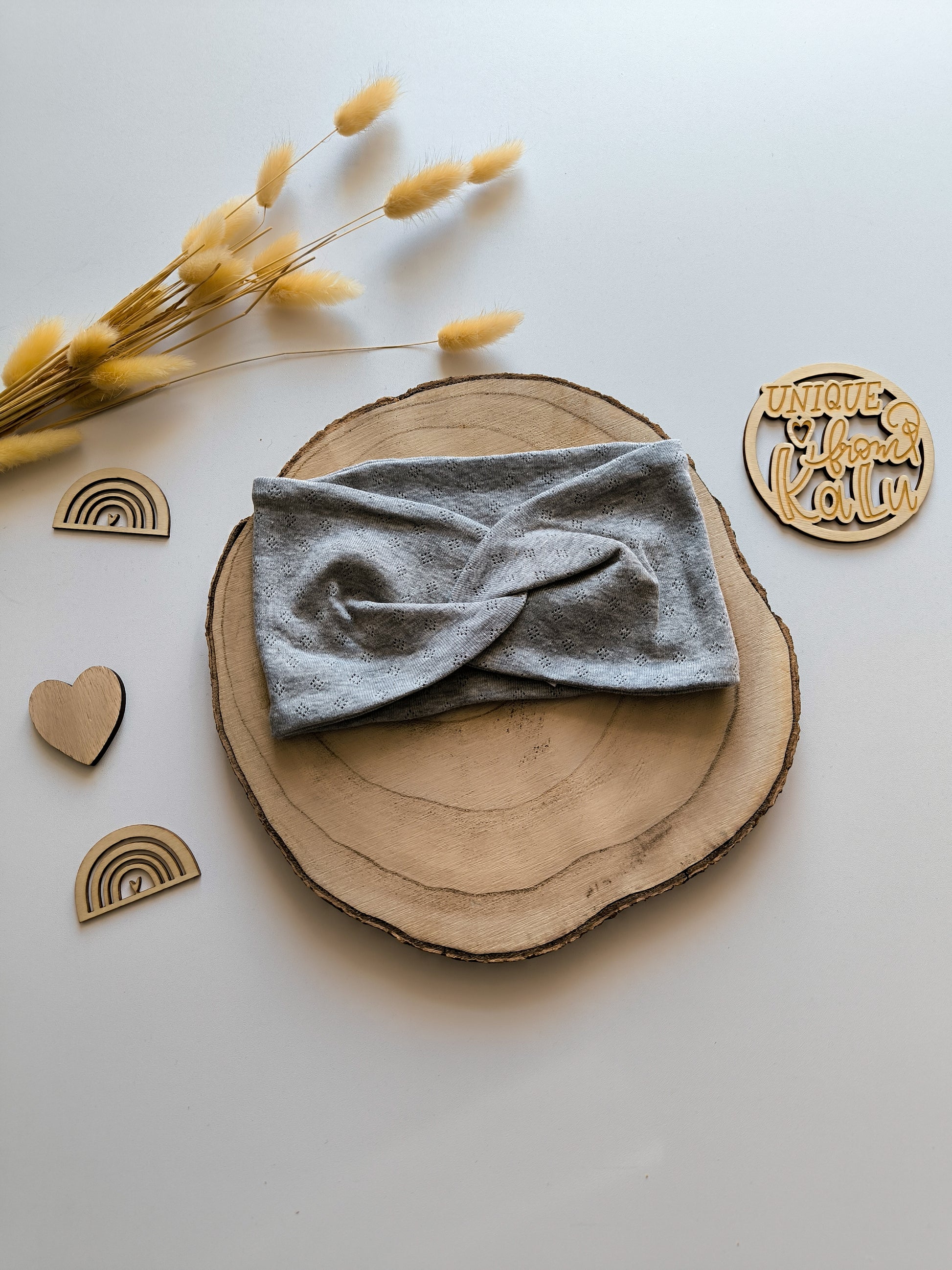 Hier siehst du ein Haarband in Turban Optik , es ist aus einem Graufarbenen Lochstrick Jersey genäht.