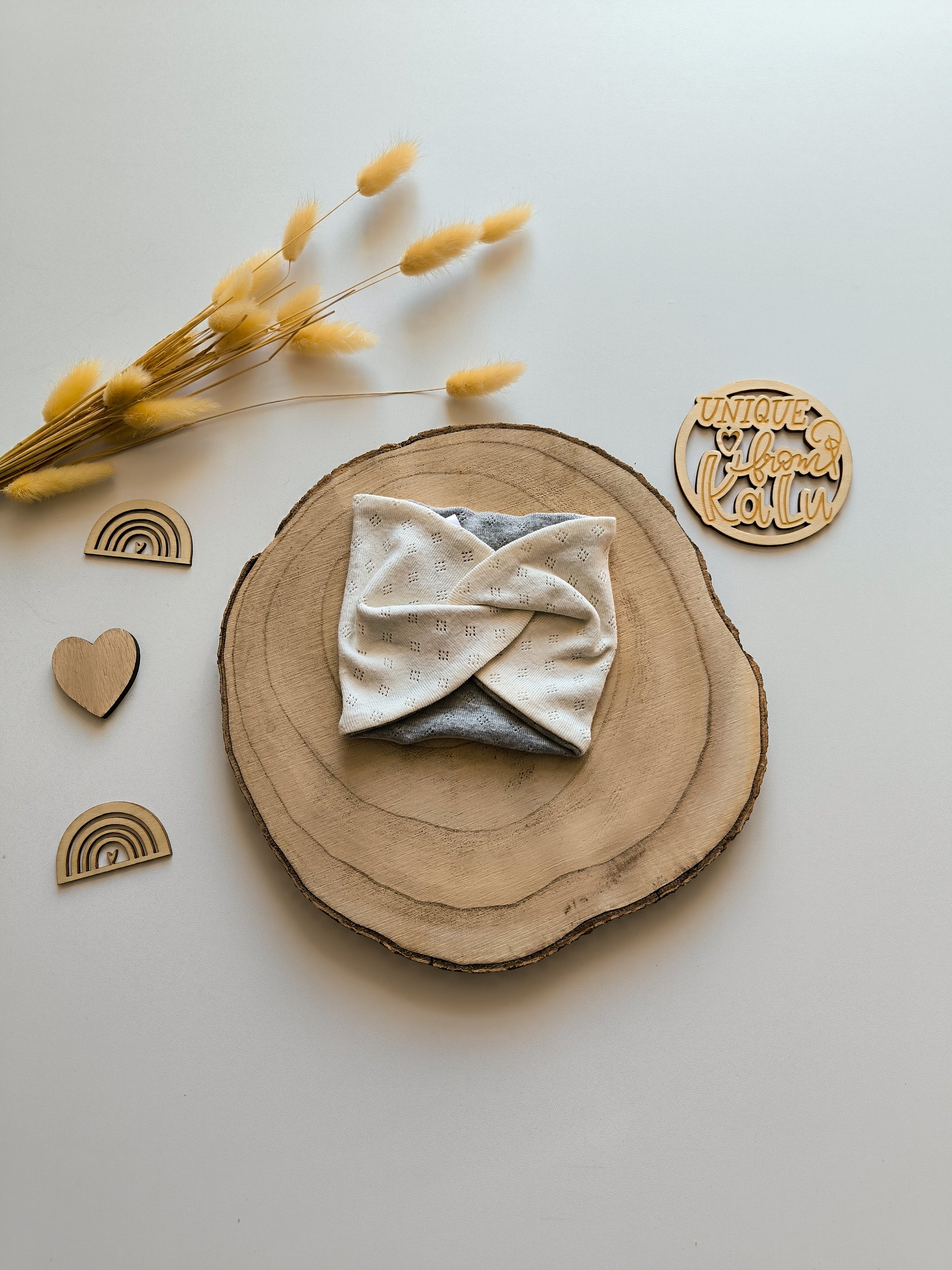 Hier siehst du ein Haarband in Turban Optik , es ist aus einem Grau und Cremefarbenen Lochstrick Jersey genäht.