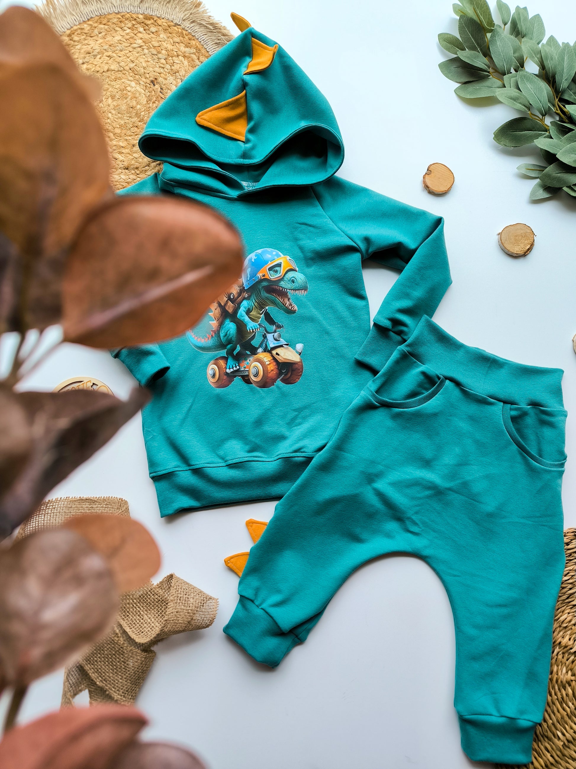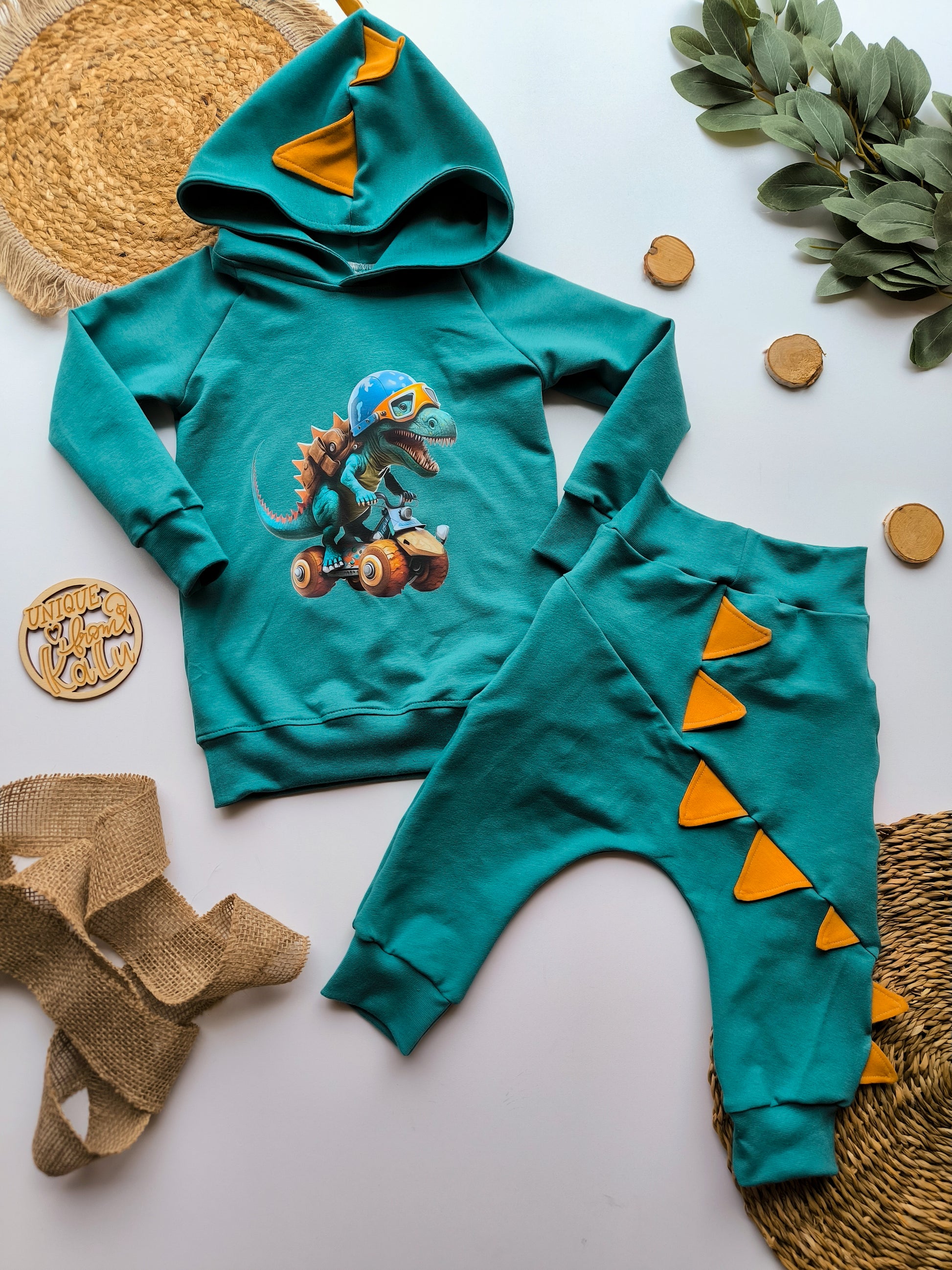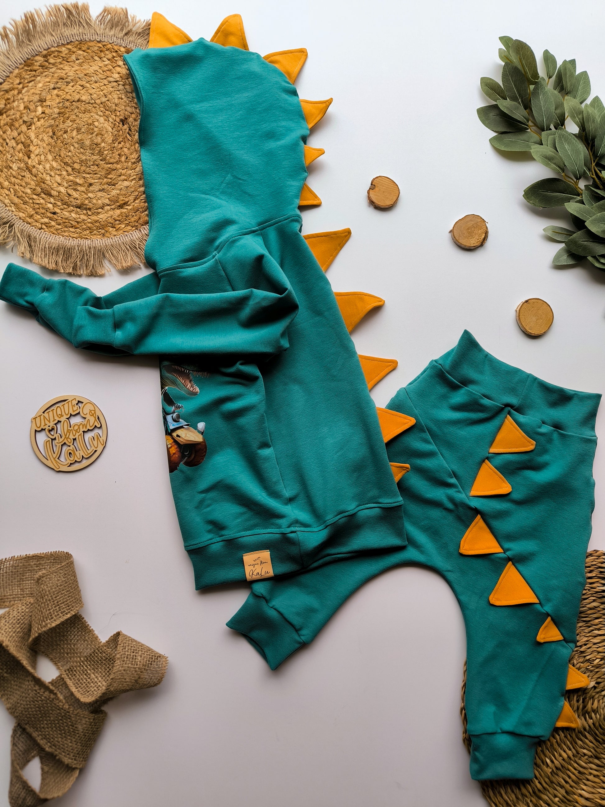Dieses handgefertigte Kinder Dino Set besteht aus einem kuscheligen Hoodie mit Dino-Stacheln und einer passenden Pumphose – perfekt für kleine Dino-Fans, die es bequem und cool lieben.