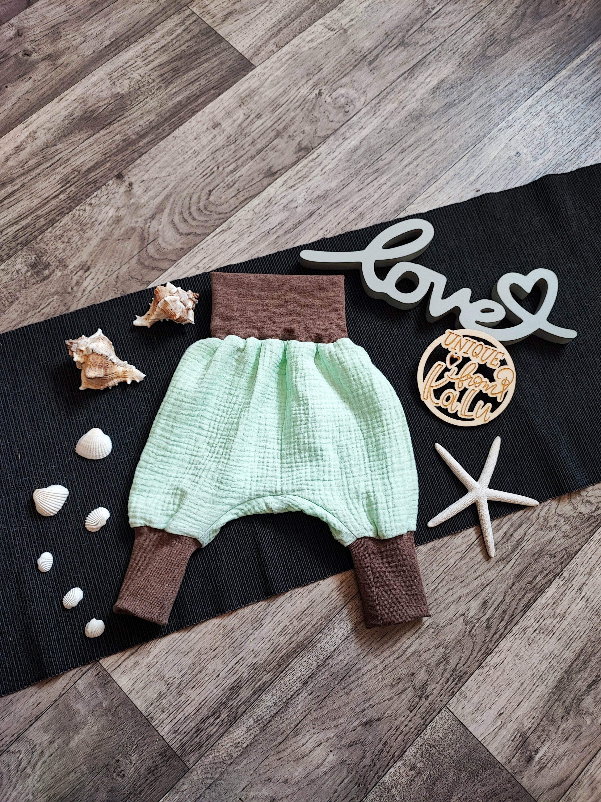 Dank der Mitwachs-Bündchen an den Beinen , wächst die Pumphose je nach Proportionen des Kindes über bis zu vier Größen mit.