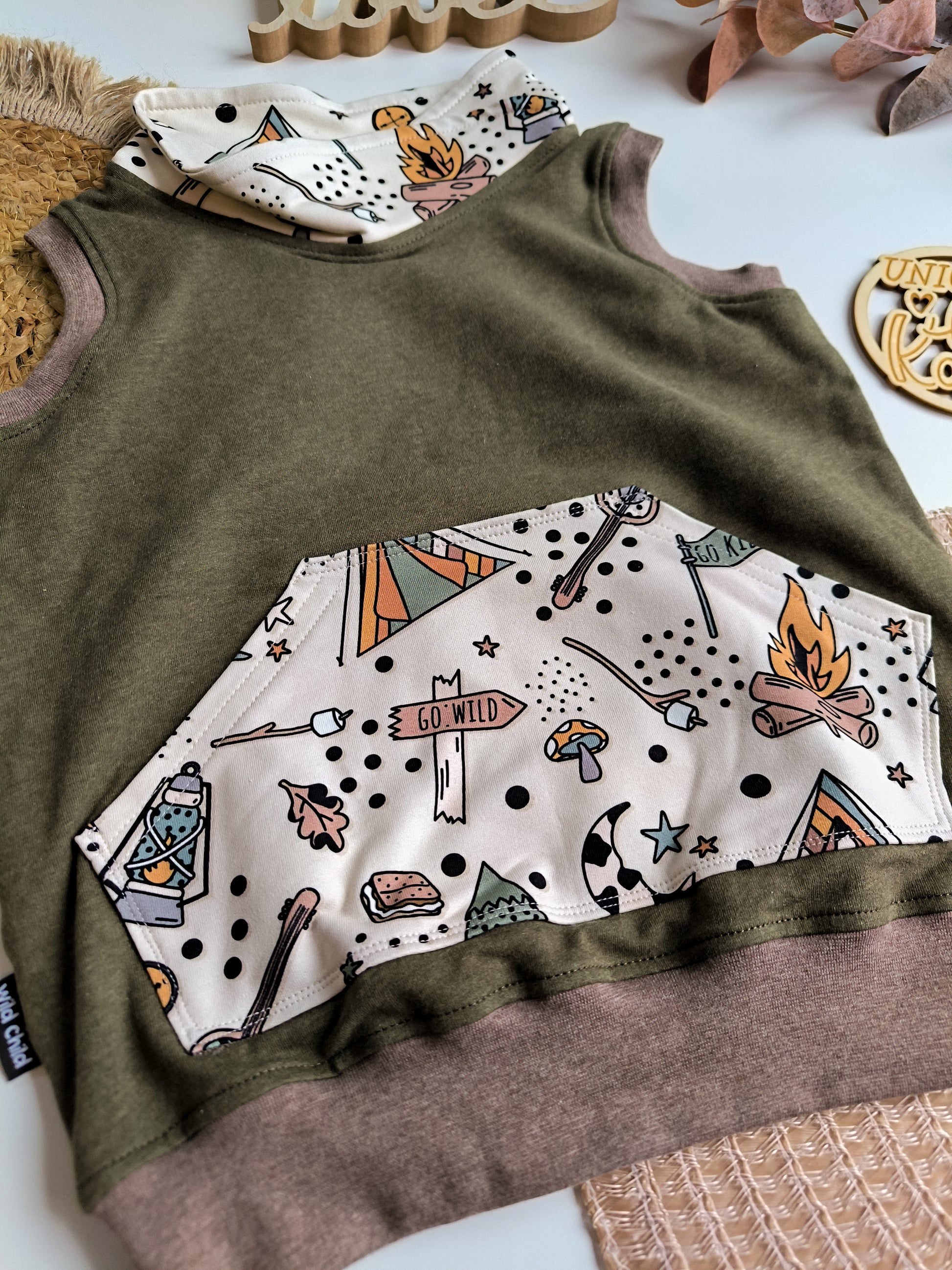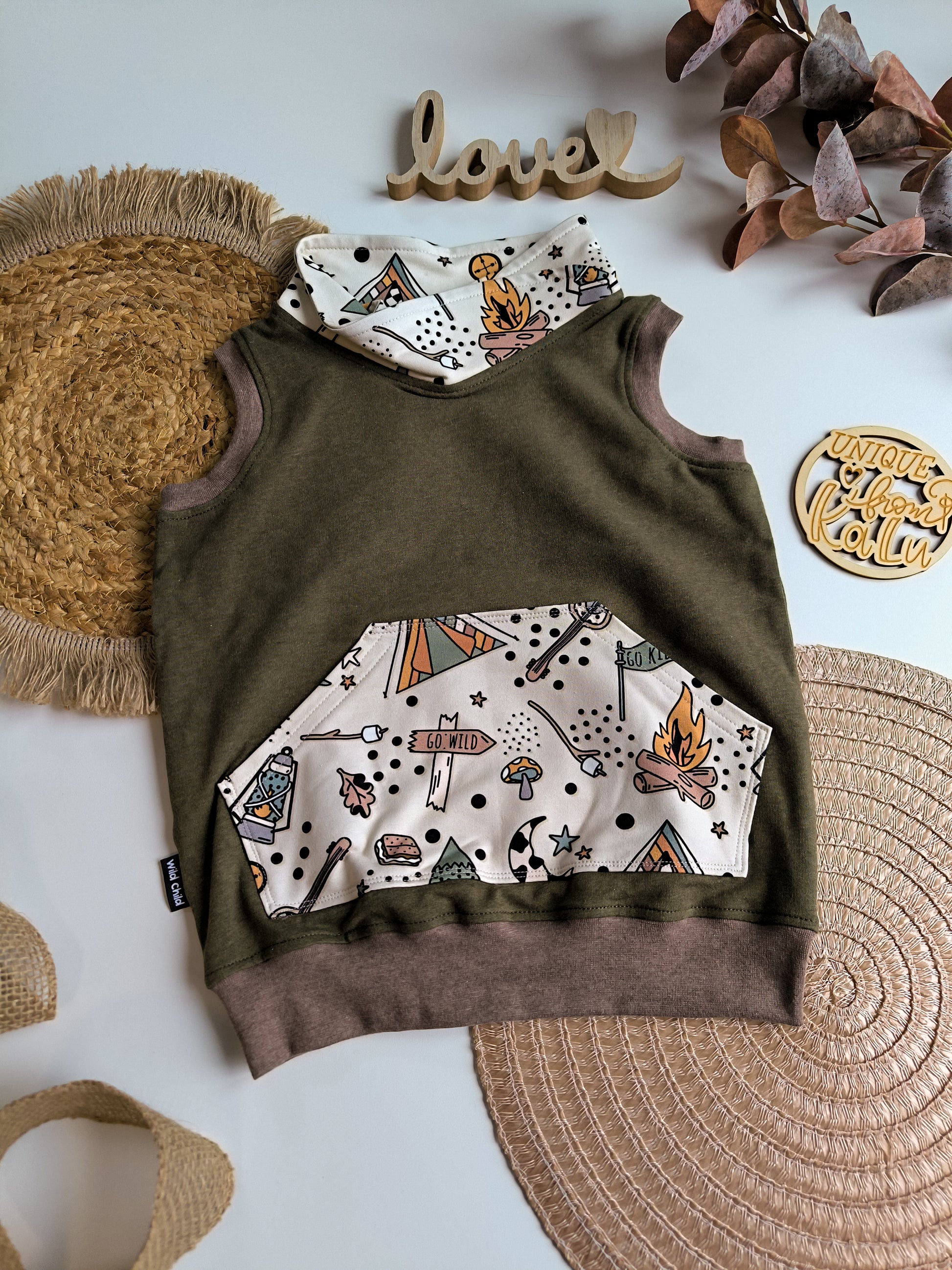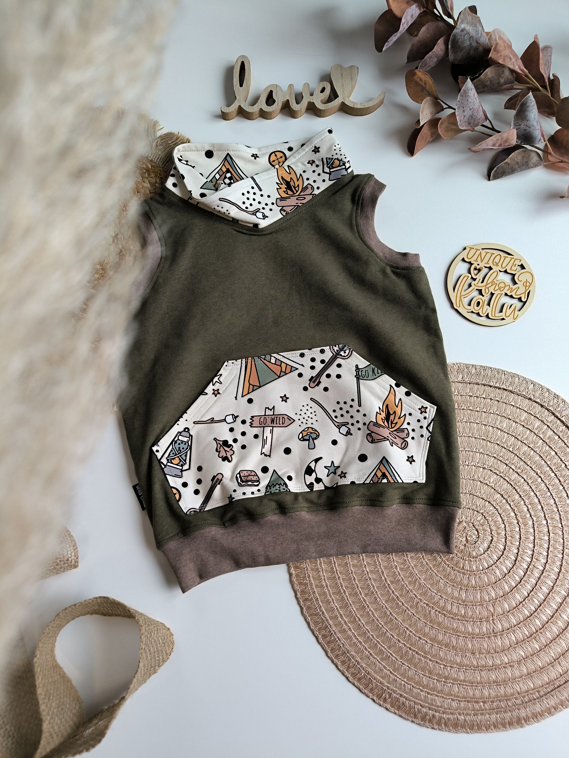 Stylisch, bequem und bereit für jedes Abenteuer! Dieser handgemachte ärmellose Hoodie in sattem Olivgrün ist der ideale Begleiter für kleine Entdecker.